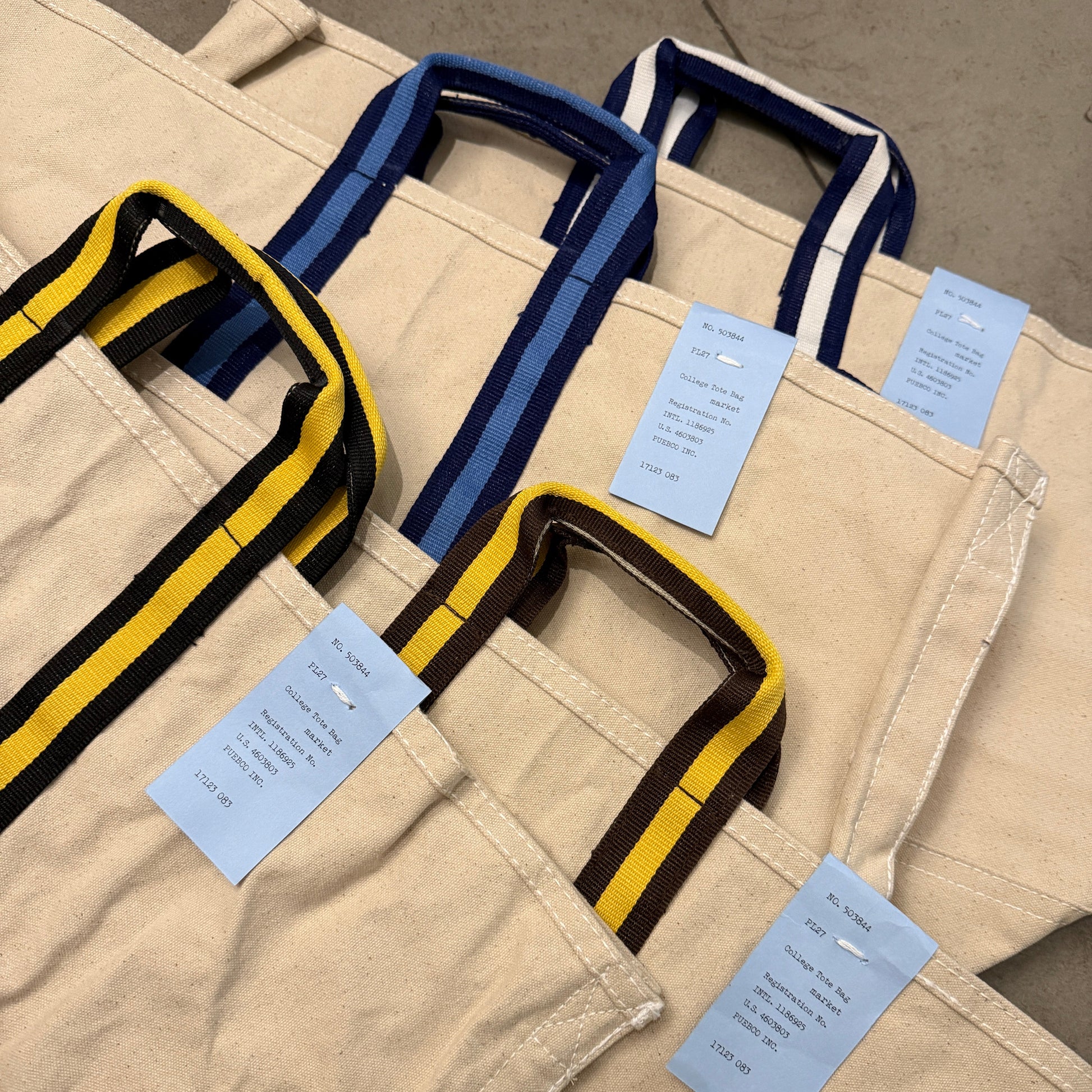 "The handle was found in a market as a belt for school uniforms. The colour scheme has a 80s feel. We selected 70 colours from that. We don't know if we'll ever find the same material or colour scheme again. The sturdy canvas has a sense of tension and stands up on its own, and when washed and dried in the sun, it becomes firm and dense, giving it a rugged look."