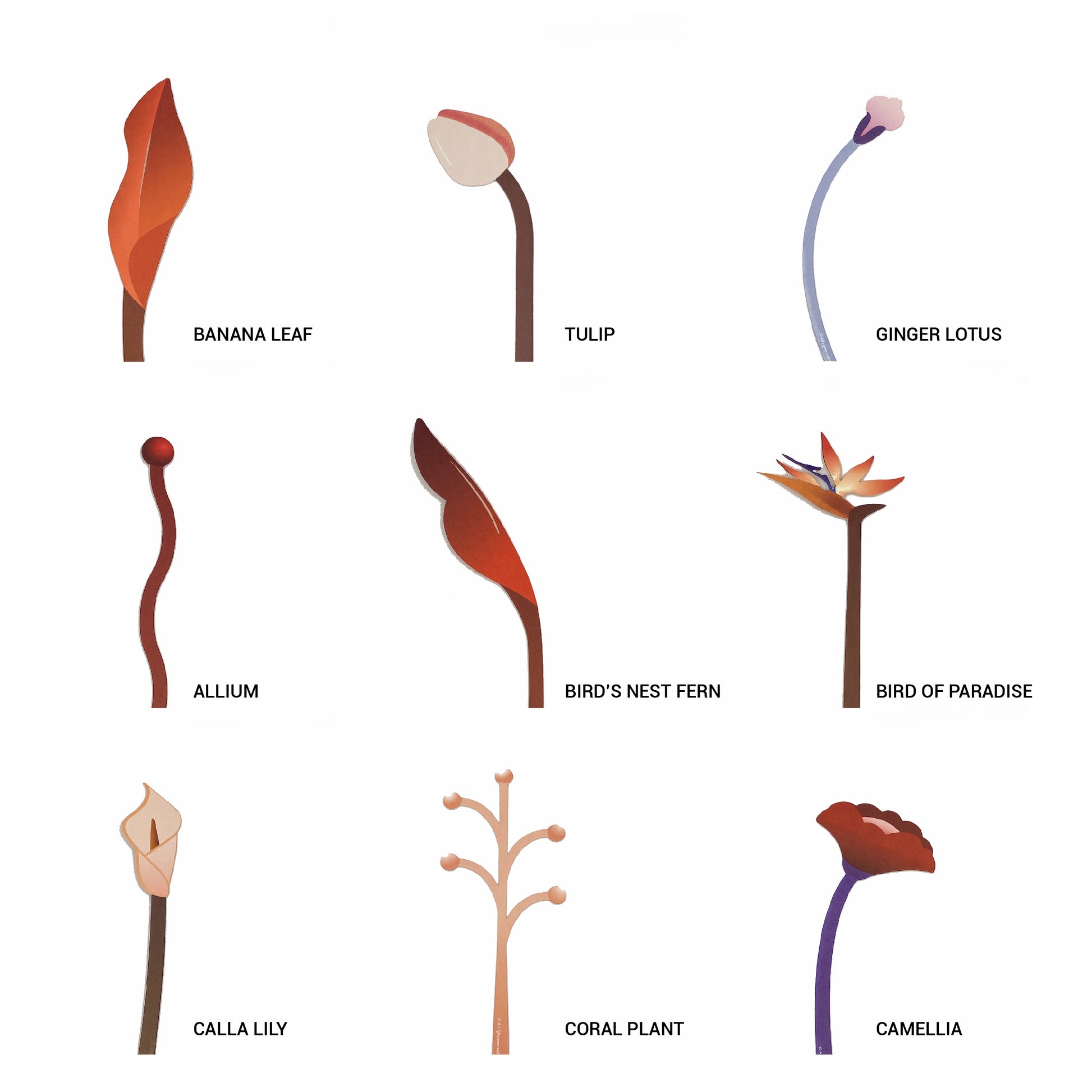 Tulip: 37.6cm (h) / Coral Plant: 34.2cm (h) / Banana Leaf: 36.5cm (h) / Ginger Lotus: 28.4cm (h) / Bird of Paradise: 37.7cm (h) / Allium: 37cm (h) / Camellia: 34cm (h) / Bird's Nest Fern: 37.9cm (h) / Calla Lily: 38cm (h)